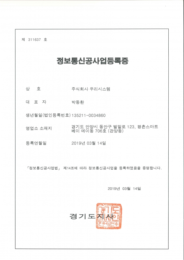정보통신공사업등록증 페이지 정보 작성자 우리시스템 작성일 19-11-13 13:18 조회 1,371회 댓글 0건 관련링크 본문 정보통신공사업등록증 이전글 다음글 목록 댓글목록 등록된 댓글이 없습니다. 이전글 다음글 목록
