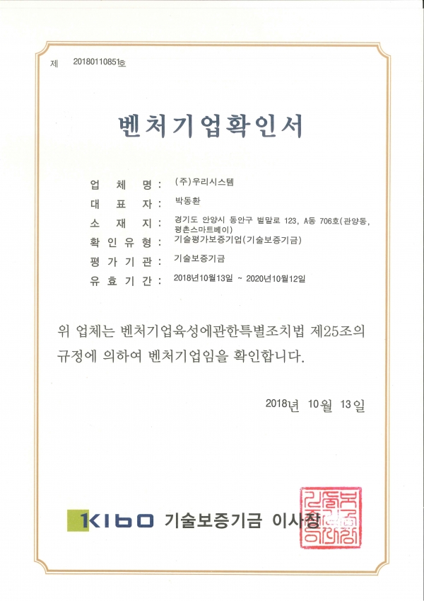 벤처기업확인서 페이지 정보 작성자 우리시스템 작성일 19-11-13 13:20 조회 1,351회 댓글 0건 관련링크 본문 벤처기업확인서 이전글 다음글 목록 댓글목록 등록된 댓글이 없습니다. 이전글 다음글 목록